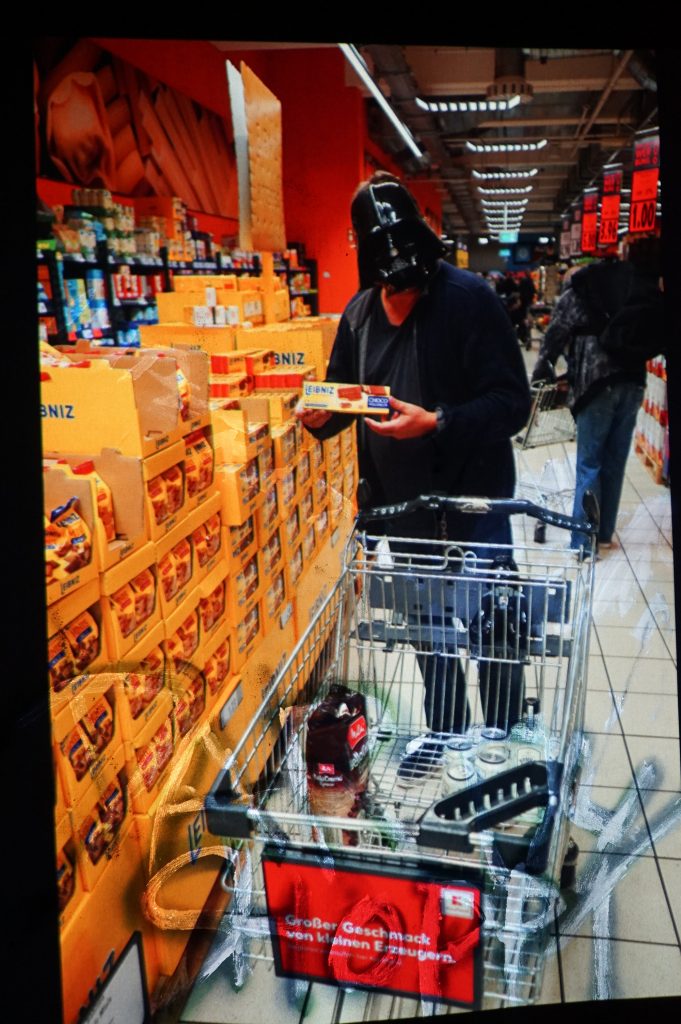 - Das Kunstprojekt „Darth shoppt“ entstand zu Beginn der Corona-Pandemie, als noch unklar war, welche Masken im Alltag getragen werden sollten. In dieser Phase der Unsicherheit geht Dirk von Burgsdorff mit einer ikonischen Darth-Vader-Maske einkaufen – eine Mischung aus Popkultur, Ironie und gesellschaftlicher Irritation. Begleitet und fotografisch dokumentiert wird die Aktion von Horst Gatscher.